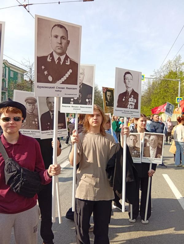 На штандартах фотографии жителей -героев ВОВ Калининского района.